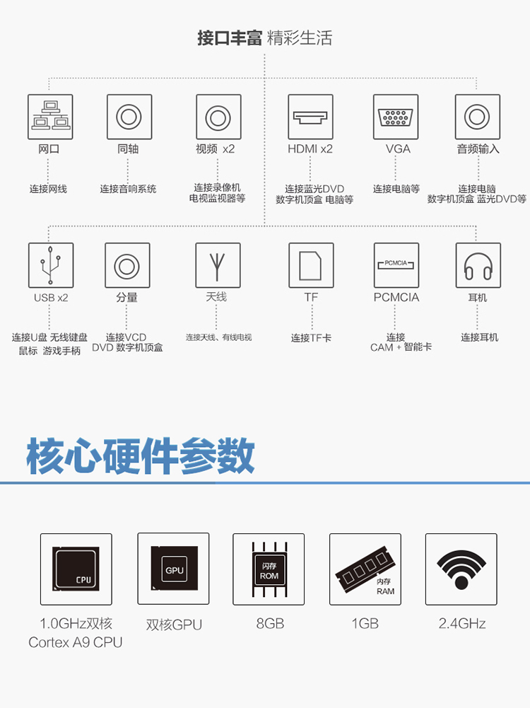 1个3.5mm音频接口,2个USB 2.0接口,2个HDMI 1.3接口,1个数字电视CAM卡槽 |